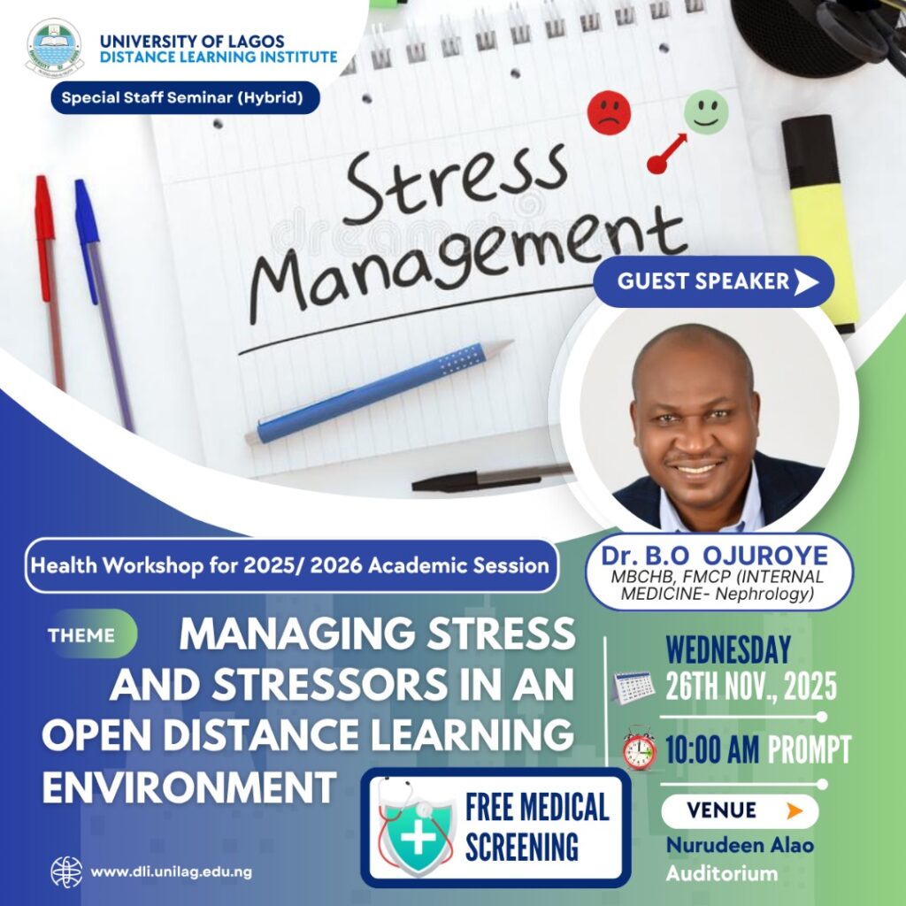 The Distance Learning Institute (DLI), University of Lagos (UNILAG), will hold a Special Staff Health Seminar for the 2025/2026 academic session on Wednesday, November 26, 2025, at 10:00 a.m. in the Nurudeen Alao Auditorium, UNILAG . The seminar on Managing Stress and Stressors in an Open Distance Learning Environment will be delivered by Dr. B. O. Ojuroye, an Internal Medicine Nephrologist. Members of the University community are cordially invited and encouraged to arrive early, as […]