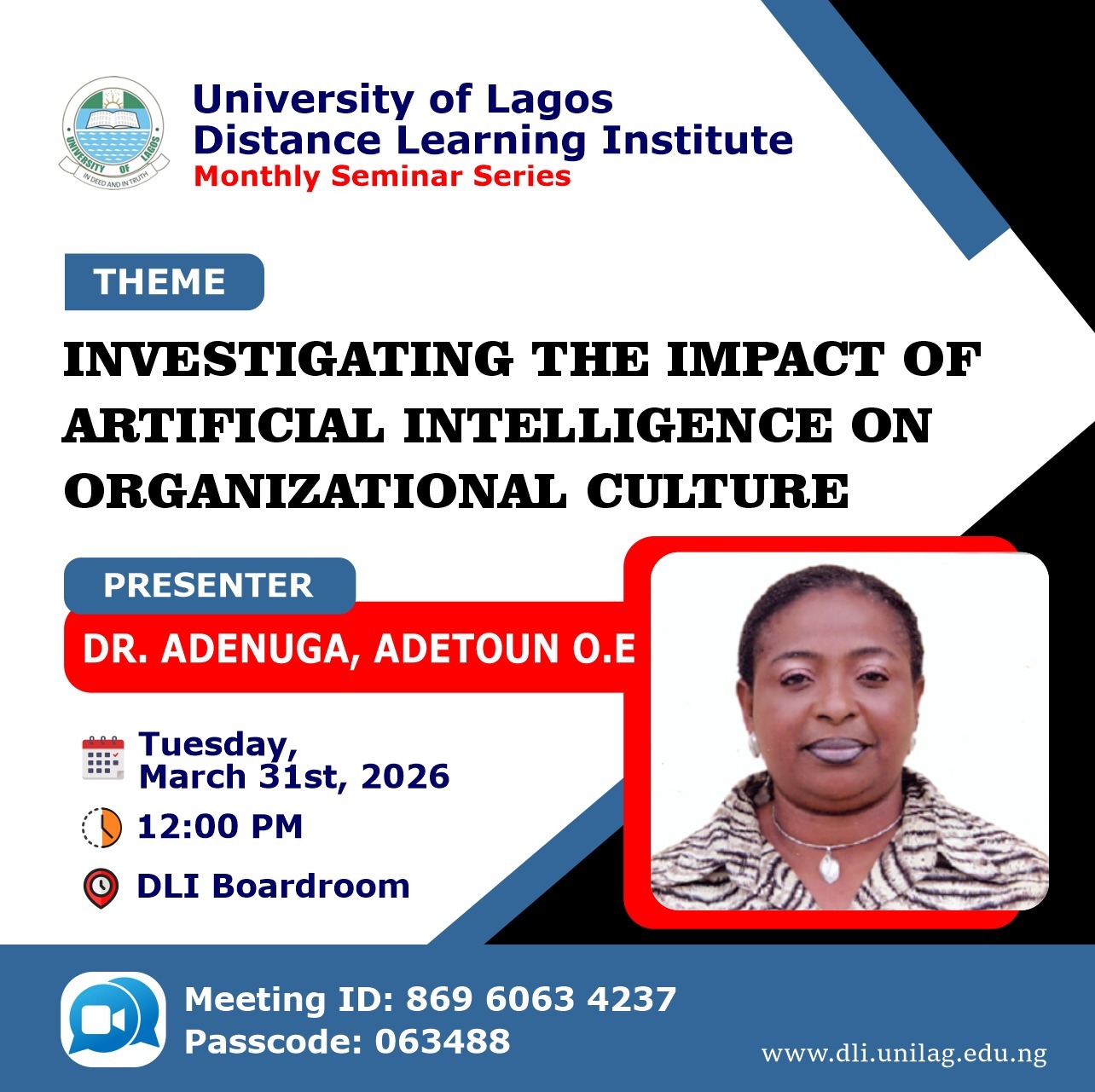 The Distance Learning Institute (DLI), University of Lagos (UNILAG) will hold the March edition of its seminar series on Tuesday, March 31, 2026 at 11:00 a.m. at DLI Boardroom, Red Bricks, UNILAG.
