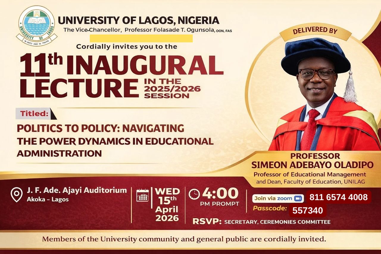 Professor Simeon Adebayo Oladipo of the Department of Educational Management and current Dean of the Faculty of Education, University of Lagos will deliver the Eleventh (11th) Inaugural Lecture in the 2025/2026 Academic Session on Wednesday, April 15, 2026 at 4:00 p.m. (Guests are to be seated by 3:45 p.m.)at the J.F. Ade. Ajayi (Main) Auditorium, UNILAG, Akoka.