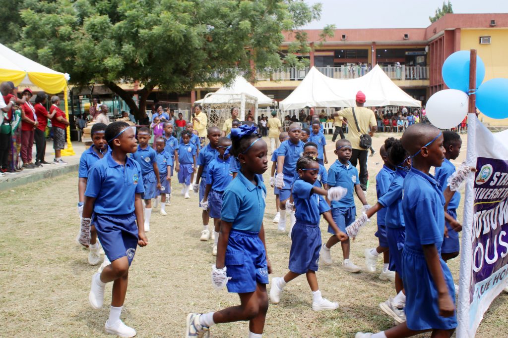 Five houses: Oduduwa (Blue), Danfodio (Yellow), Obi (Purple), Emotan (Red), and Jaja (Green), competed in sprints, novelty races, ball-picking contests, and the crowd-favourite: elephant race.