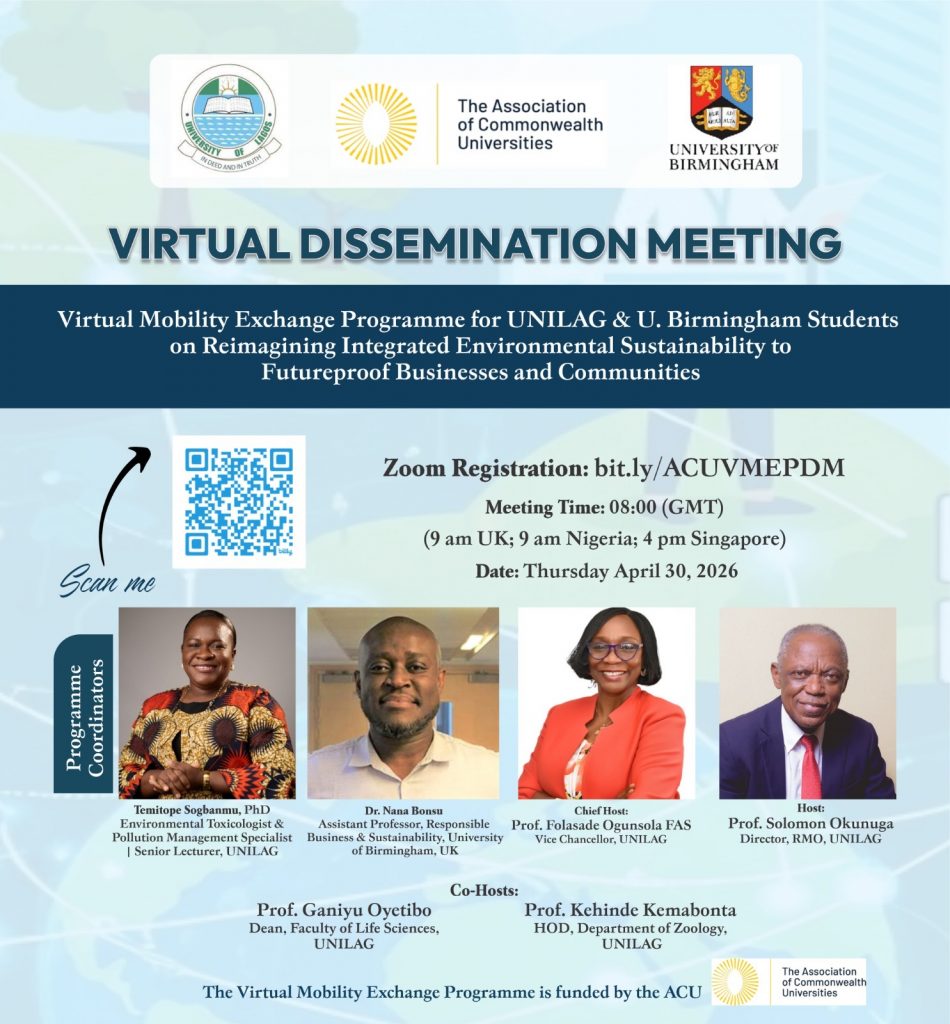 Dr. Temitope Sogbanmu of the University of Lagos and Dr. Nana Bonsu of the University of Birmingham Business School, United Kingdom will co-host a Virtual Mobility Exchange Programme Dissemination Meeting on Thursday, April 30, 2026 .