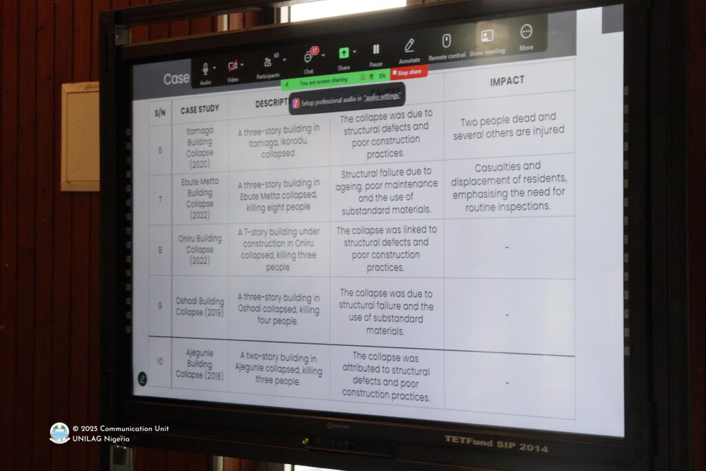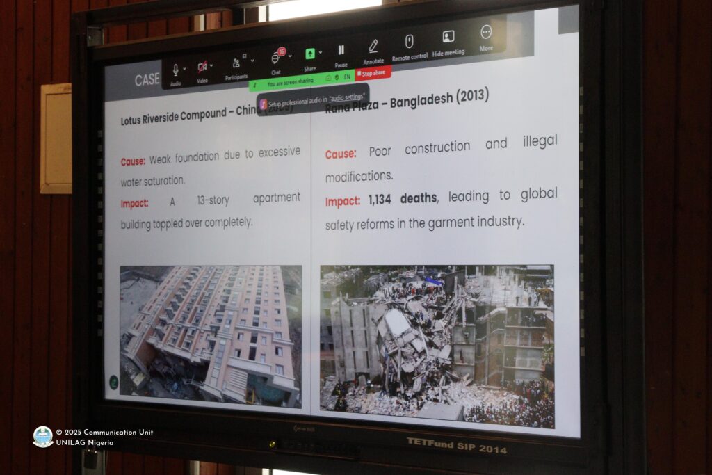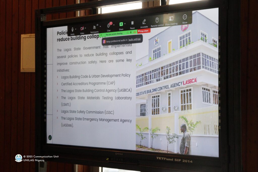 Titled: Recurring Building Collapse in Lagos: The Challenge of Regulatory Oversight and Construction Practices, Dr. Salako’s presentation highlighted his hindsight on the Lagos State building subsector and how illegal building approvals, poor and substandard artistry, insufficient professional engagements, structural defects, poor oversight, regulatory failure and poor construction practices have infiltrated and continued to plague the building culture in Lagos.