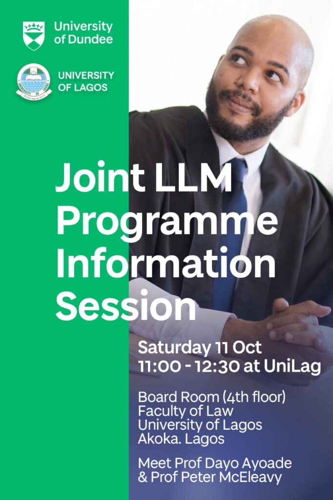 The University of Lagos in collaboration with University of Dundee, United Kingdom will hold an information session on its Joint LL.M. Programme on Saturday, October 11, 2025 from 11:00 a.m. – 12:30 p.m. (WAT) at the Faculty of Law Boardroom, University of Lagos.