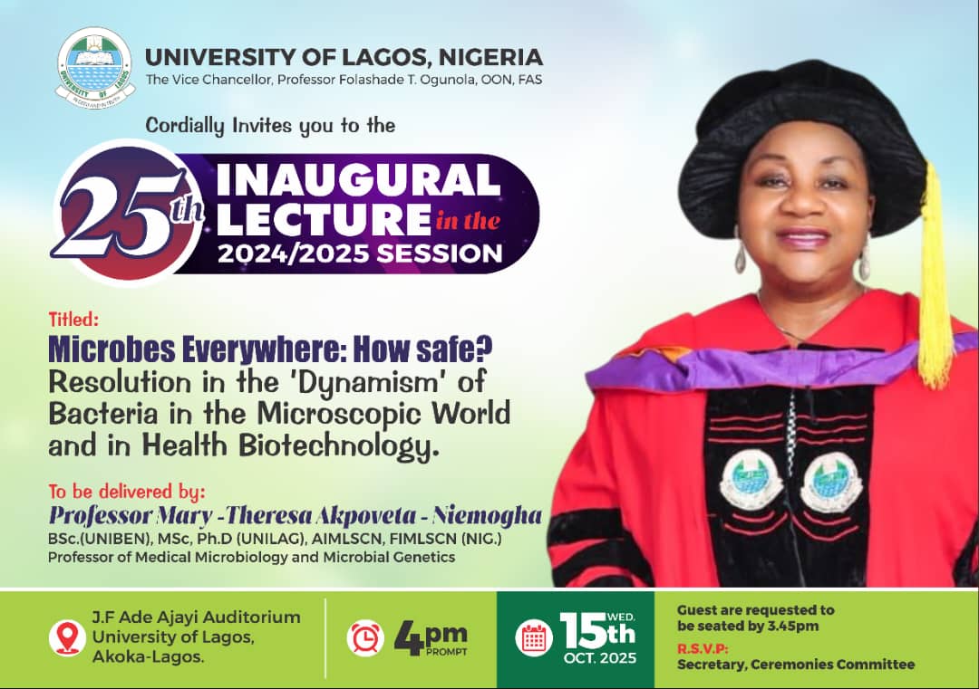 Professor Mary-Theresa Akpoveta-Niemogha of the Department of Medical Laboratory Science, Faculty of Basic Medical Sciences, College of Medicine, University of Lagos (UNILAG) will deliver the twenty-fifth (25th) Inaugural Lecture of the 2024/2025 Academic Session on Wednesday, October 15, 2025, at 4:00 p.m. (Guests are to be seated by 3:45 p.m.) at the J. F. Ade Ajayi Auditorium, UNILAG, Akoka. The Vice-Chancellor, Professor Folasade T. Ogunsola, OON, FAS, will preside over the Lecture titled: Microbes Everywhere: […]