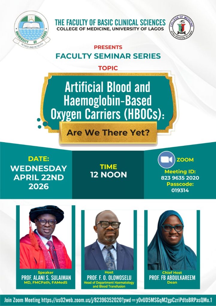 The Faculty of Basic Clinical Sciences, College of Medicine, University of Lagos, cordially invites members of the University Community and the interested public to its upcoming Faculty Seminar Series, on Wednesday, April 22, 2026, at 12:00 noon via Zoom.