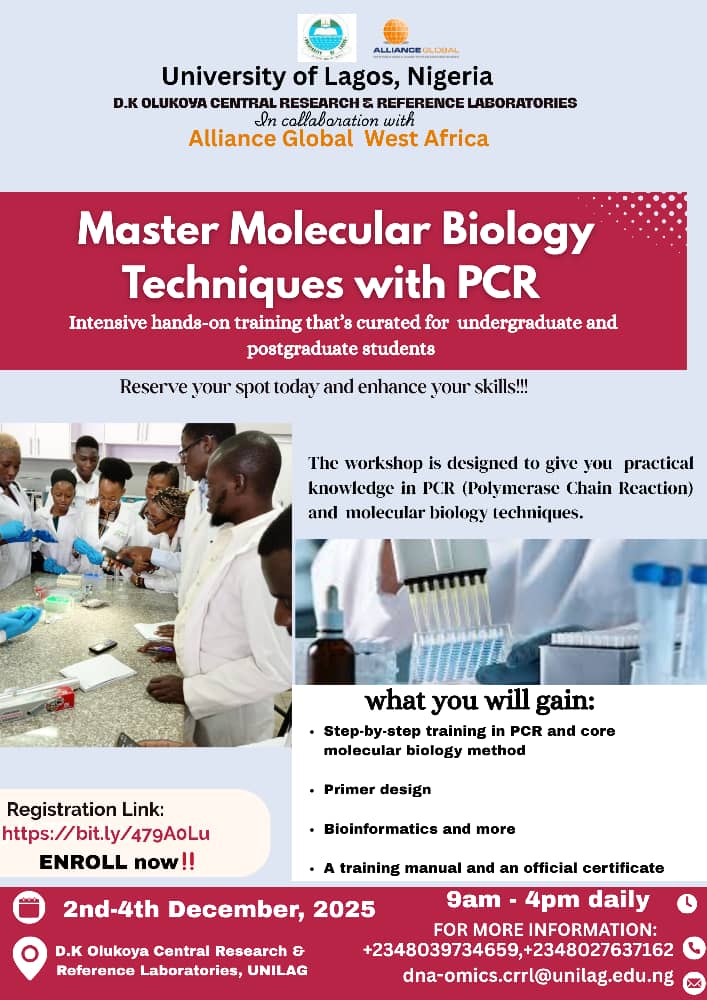 The University of Lagos (UNILAG), through its D.K Olukoya Central Research & Reference Laboratories and in collaboration with Alliance Global West Africa, is proud to announce an upcoming workshop: “Master Molecular Biology Techniques with PCR.”